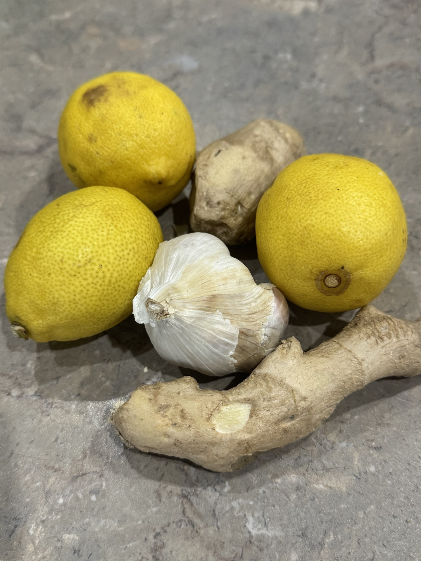 Slow boil the water, garlic, ginger, and lemon for 45 minutes. Strain (I use my gravy strainer) and serve with raw honey. Keep any extra in the fridge, I store mine in mason jars. Drink 1 cup a day for 2 days.